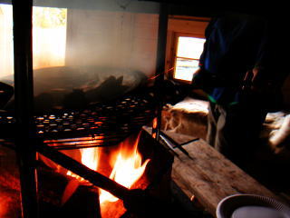 牧場からすこし移動して、小さな小屋に。中には火が、暖炉みたいな、違うな、室内たき火みたいなものか、